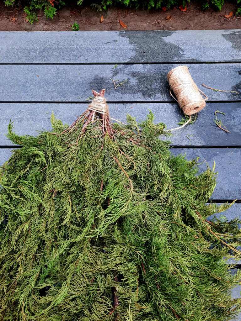 - Je pakt de takken samen en zorgt dat ze mooi vallen. Zorg ook dat de takken aan de bovenkant samen blijven.