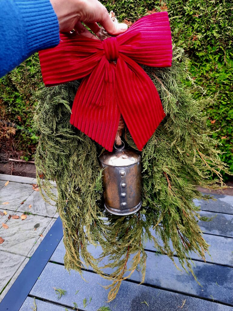 Je kersttoef is klaar om ergens een mooi plekje te krijgen. Je kunt de toef nu op je voordeur hangen met een deurhanger of een haakje.